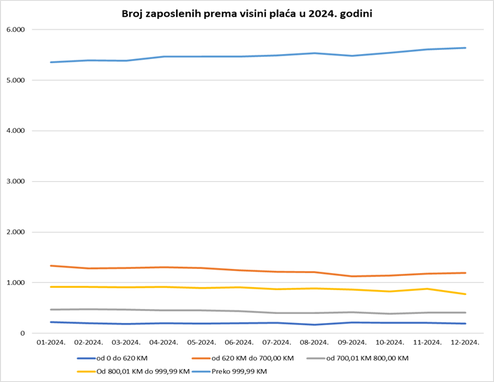Struktura plata otkriva dodatne slojeve problema. Često se u javnosti misli da su NVO-i poslodavci koji nude sigurne, stabilne i dobro plaćene poslove. Međutim, podaci za 2024. godinu pokazuju drugačiju sliku. što na prvi pogled djeluje kao pozitivna informacija. Ali kada se detaljnije pogleda kretanje kroz godinu, vidi se da je upravo srednja grupa radnika, s primanjima između 800 i 999 KM, najviše pogođena.